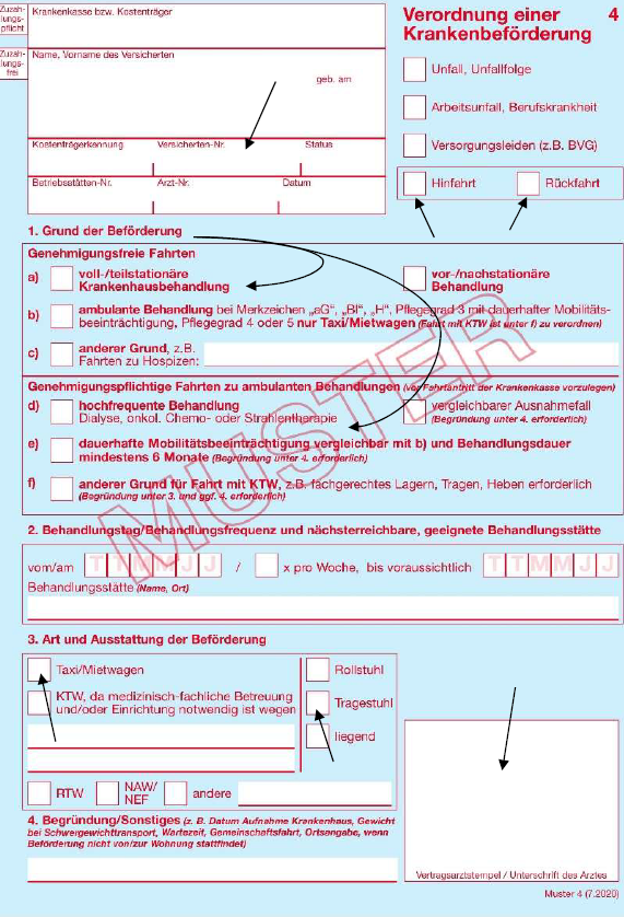 Die Abrechnung der Fahrkosten erfolgt in den meisten Fällen an die Krankenkasse des Patienten und damit das reibungslos funktioniert, muss der sog. Transportschein („Verordnung einer Krankenbeförderung“) vollständig und korrekt ausgefüllt sein: